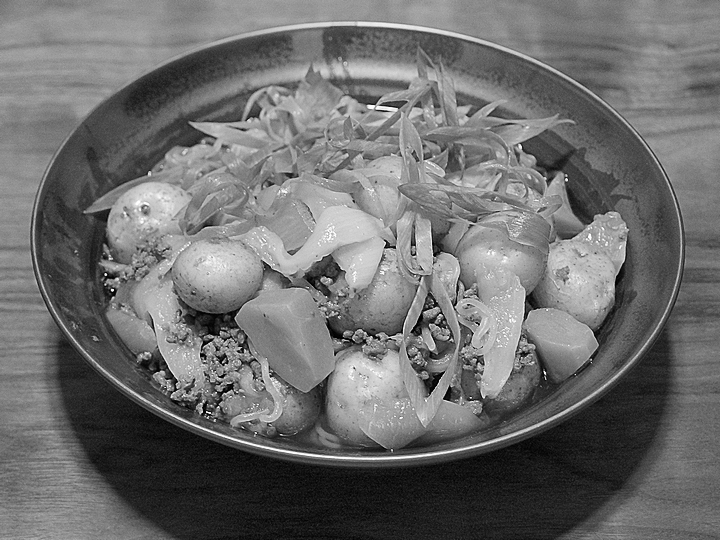 今年はジャガイモが豊作らしく、安値でスーパーに出回っています。夕食は小じゃがいもと挽き肉を使った「肉じゃが」です。