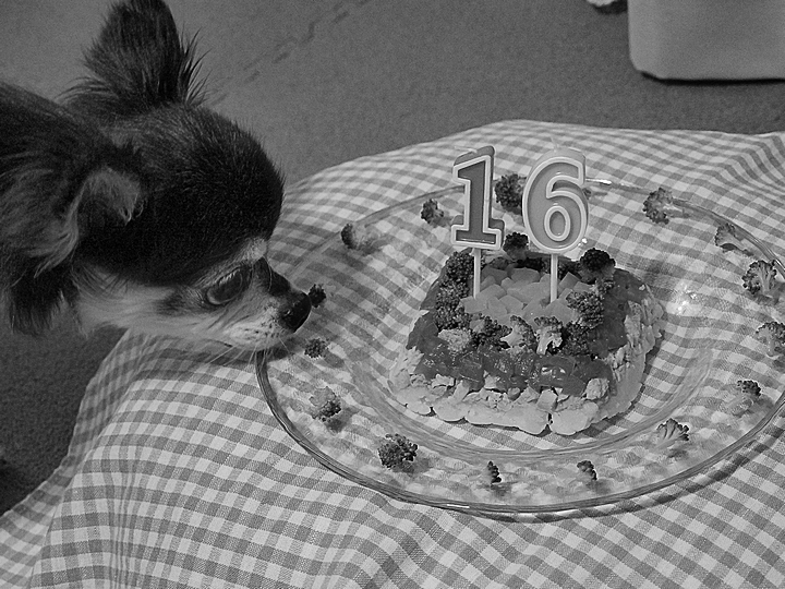 2018年8月4日 日々 16歳 味付けをする前のポトフの具材(鶏肉・人参・ジャガイモなど)を使い、バースディケーキ風に。チワワの16歳は人間で言えばおよそ80歳だそうです。不審げにケーキのにおいを調べるチワワ息子。 suzuki