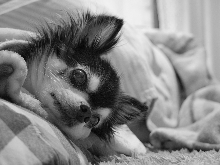 肌寒い日、毛布にくるまり呆(ほう)けているチワワ息子。