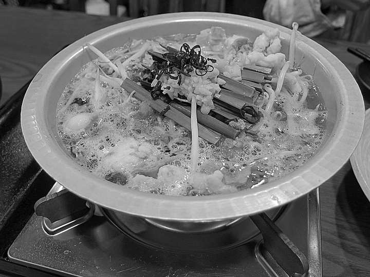 今日は前々から気になっていた一品を注文しました。牛の腸を揚げたものが「油かす」ですが、これを鍋仕立てにしたもの。関西風の出汁に溶けた脂の旨味が独特。具材はシンプルにもやし・ニンニク・ニラ・鷹の爪など。