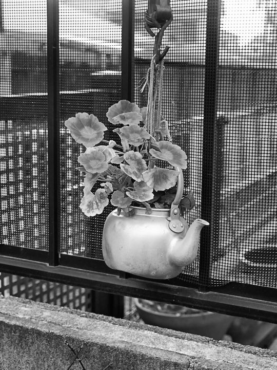 小さなヤカンが植木鉢の代わりに使われていました。