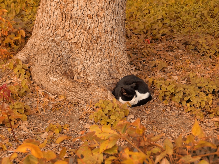 二匹目の猫を発見。こういう模様は「ハチワレ」と呼ぶのでしょうか。