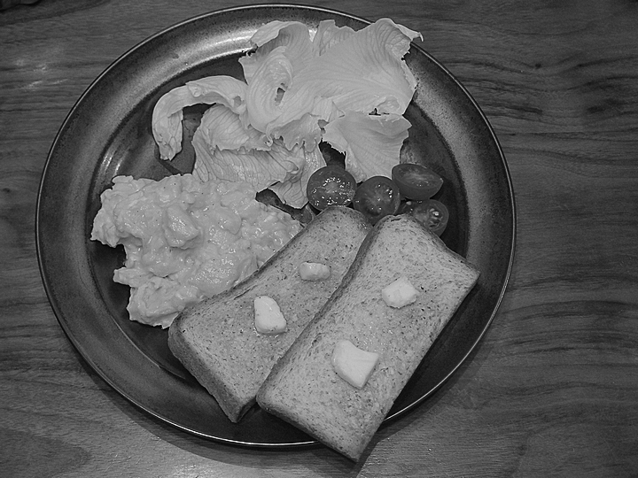 今日の朝食は食パンとスクランブルエッグ、紅茶。