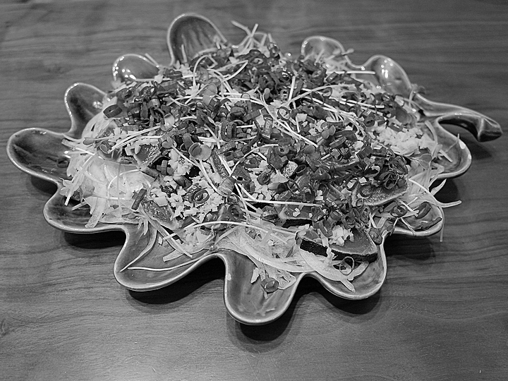 以前と作り方が違う点。生姜はすり下ろさず、みじん切り。ニンニクはガーリックチップにする。ポン酢は食べる直前にかける。水気が出ないよう、徹底します。