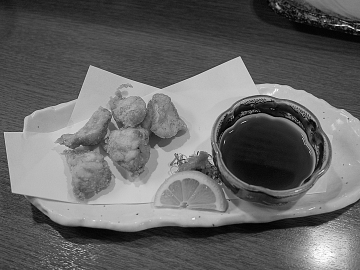 ここらで揚げ物を。フグの唐揚げはビールによく合います。