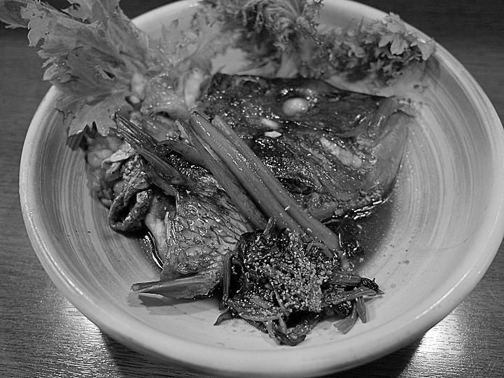 次はお店の名物である鯛のあら炊きを注文。頭と頬の肉が美味。眼の周囲のゼラチン質の部分も忘れずに頂きます。