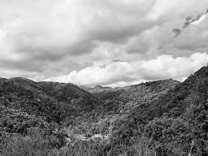 山の中腹からの眺め。山寺の屋根が小さく見えています。