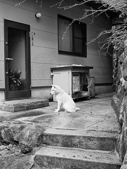 軒先で飼われている犬。行儀よくお座りをしていました。