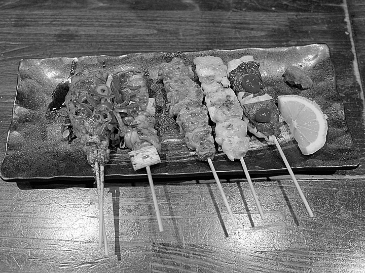 今日は焼き鳥屋さんへ。適当に串盛りとお漬物などを注文。あと餡かけ焼きおにぎりも。