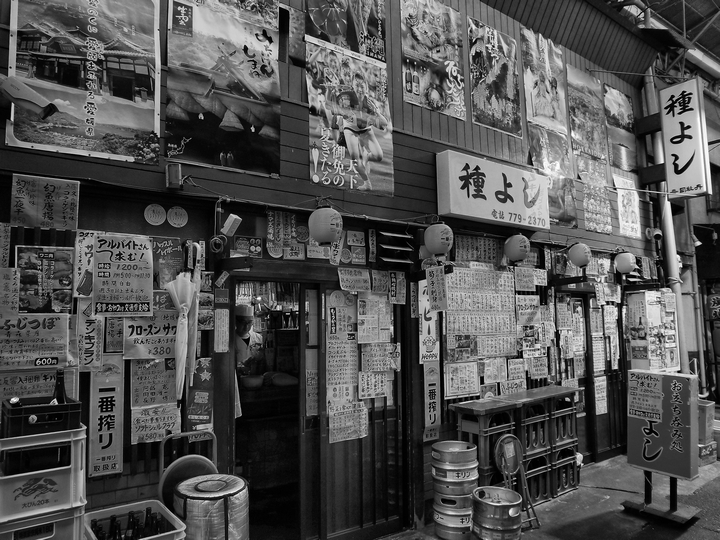 居酒屋の壁一面に貼り付けられた、広告やお品書き。