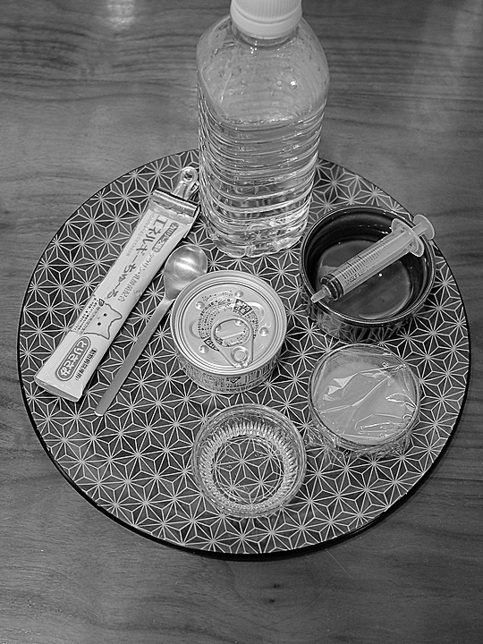 いつでも与えることが出来るように、机に置かれたチワワ息子のご飯と薬。