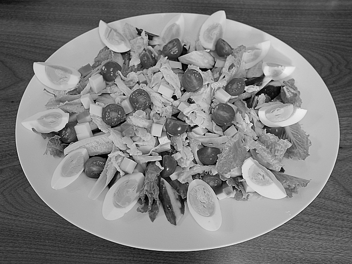 具材はサラダチキン・スモークチーズ・ロメインレタス・トマト・卵・キュウリなど。味付けは普通にフレンチドレッシング。