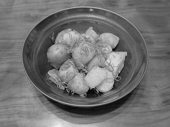 皮付きの新じゃがを茹で、醤油・砂糖・酒・みりん・バターで味つけ。