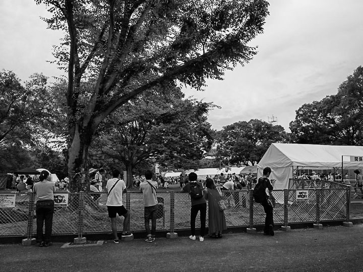 野外コンサート会場の外で、音だけでも聞こうとタムロする人々。
