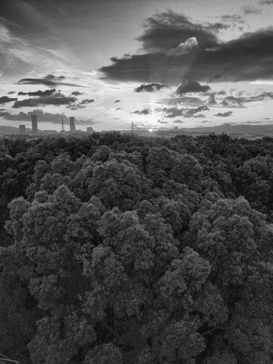 森に落ちる夕日。暦の上では「立秋」を過ぎましたが、夏の気配は衰えを見せません。