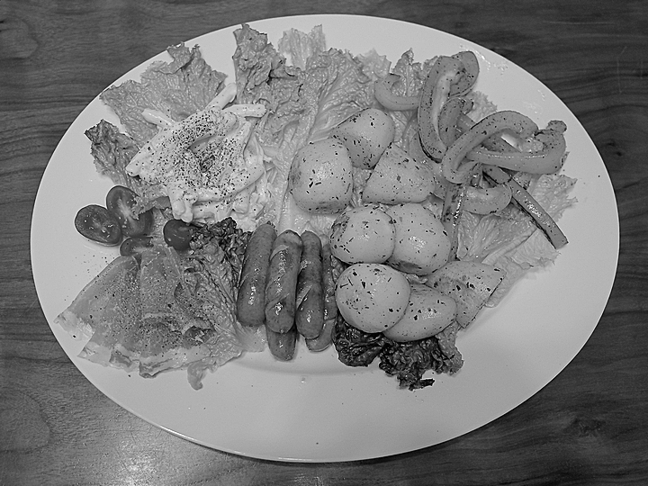 定期的な冷蔵庫掃除のため、残り食材を消費。レタス・パプリカ・ミニトマト・じゃがいも・ソーセージなどなど。