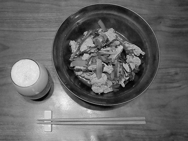 今日の夕食は有り合わせの材料で炒めもの。醤油・酒・みりん・オイスターソースで味付け。
