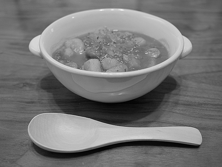 レパートリーを増やすため、新たな料理に挑戦。トマト缶を使ったイタリア風野菜スープ。白い器はシチュー用に新調したもので、KINTO「ほっくりシチューボウル・白」。