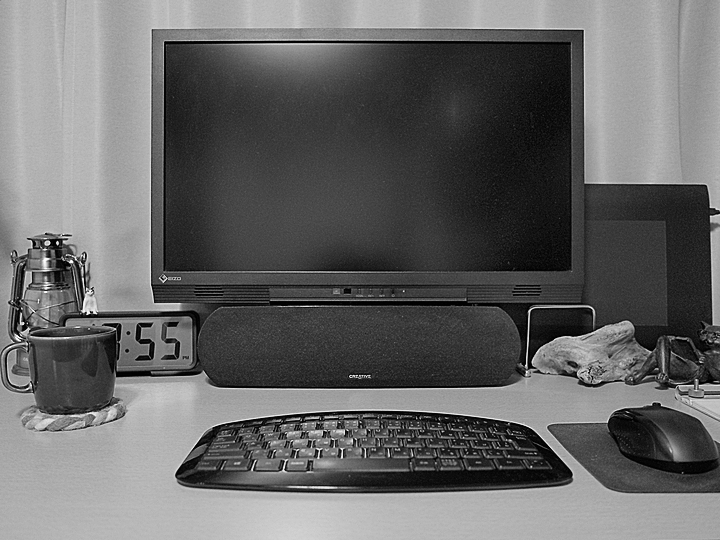 災害用のLEDランタン、「園芸祭り」で見つけた流木、カプセルトイの「座る猫」などが増え、机上がゴチャゴチャしてきました。うーん。