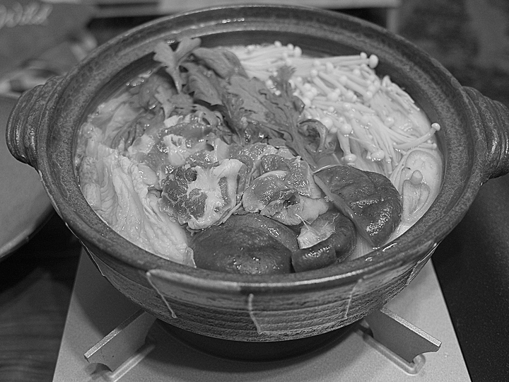 鍋の季節、定番の豚しゃぶ。具材は白菜・白ネギ・菊菜・椎茸・エノキ・豆腐。材料費や調理の手間を考えると、鍋はこのレシピになってしまいがち。