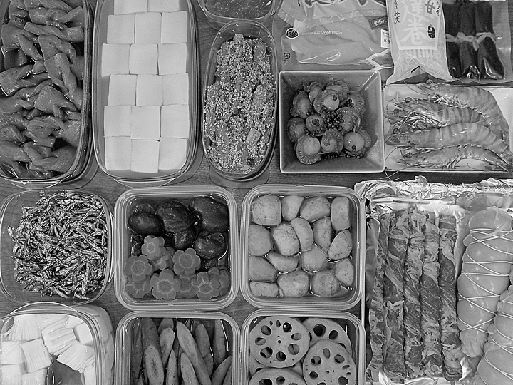 煮しめ・高野豆腐・八幡巻き・菊花かぶら・たたき牛蒡・田作り・紅白なます・昆布巻き・黒豆・エビ・ホタテ・カマボコ・伊達巻・数の子などなど。