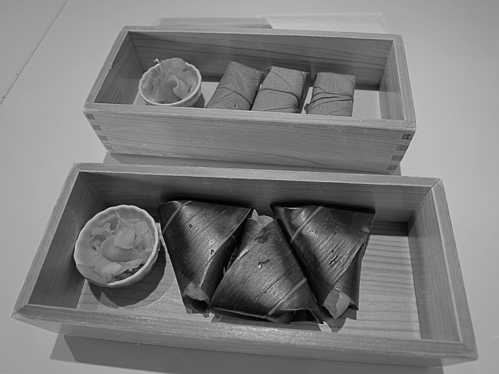 郷土料理の柿の葉寿司をいただきました。鯖や鮭の切り身と酢飯を合わせ、柿の葉で巻いたもの。