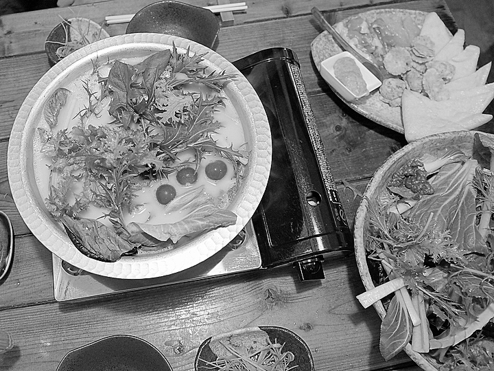 駅近くのお店で注文した、地鶏スープ仕立ての大和野菜鍋。具材はみず菜・大和やま・わさび菜・かつお菜・しろな・たかな・赤軸ほうれんそう・ちんげん菜。