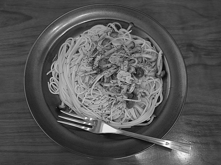 昼食はペペロンチーノにシメジを投入した一品。シンプルで悪くない味でした。