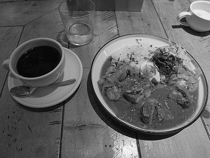 昼食は喫茶店でチキンカレーなど。肉がゴロゴロ入っていて、量が多かったです。
