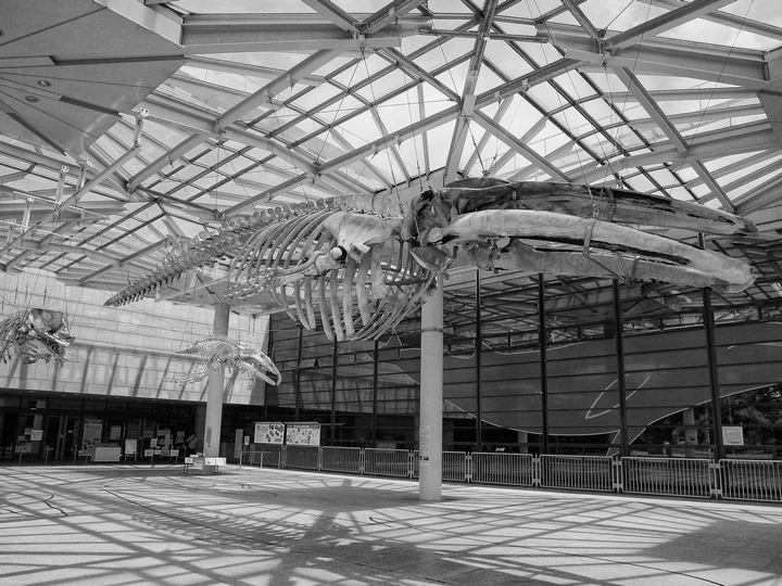 前々から来てみたかった、市立の自然史博物館へ。入り口には、ナガスクジラの標本。