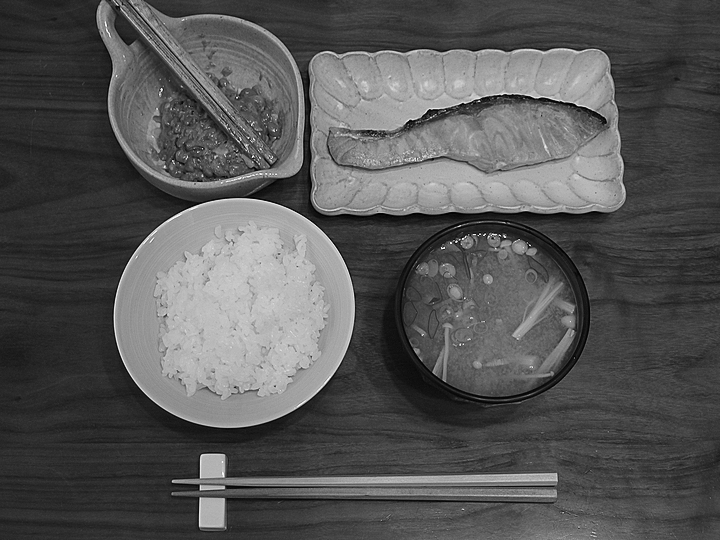 いつもの朝食ですが、食器が少し変わりました。納豆鉢「涼風」・納豆棒「千段」・見谷陶器「濃釉鎬 長角皿」など。