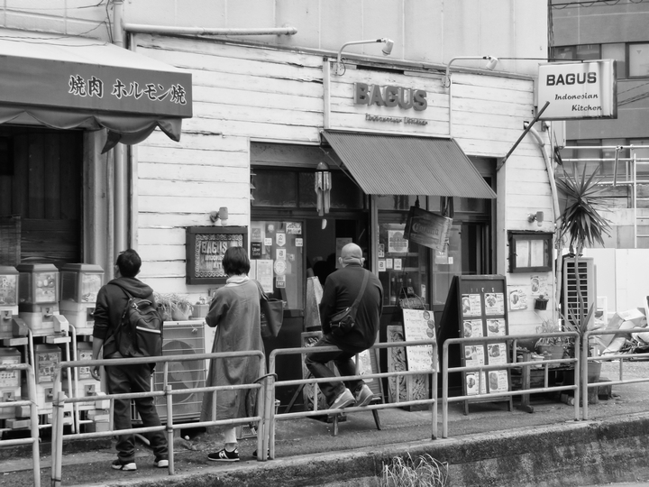 お店に並ぶ人々。望遠ズーム機能、通りの向かい側からでも撮影できるのが便利です。