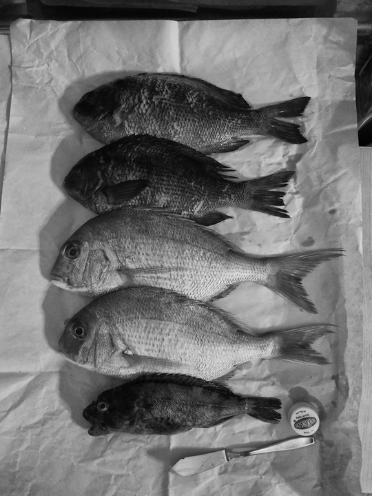 お魚屋さんで買ってきた鯛と黒鯛。塩焼きや煮付けにします。