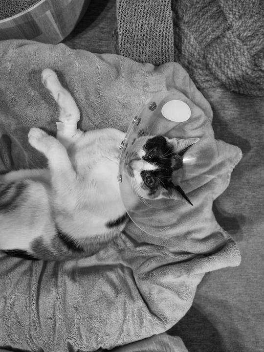 保護してからもうすぐ10ヶ月、避妊手術を受けた猫(推定年齢11ヶ月)の様子。エリザベス=カラーをつけられて不満顔。